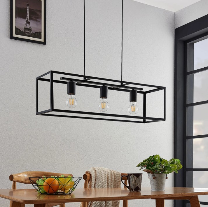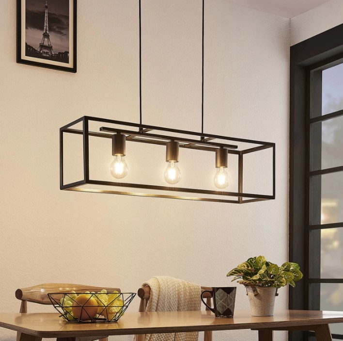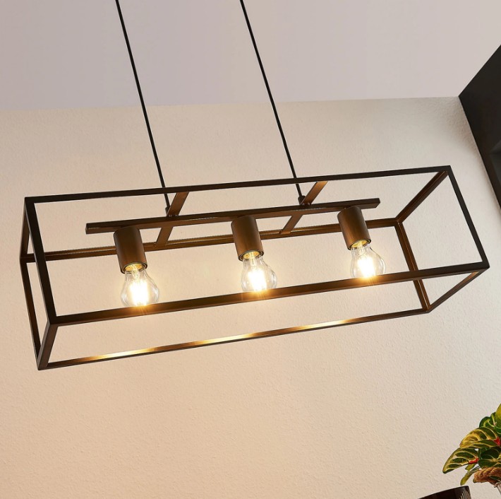 Suspension extra en forme de cadre au design ouvert en forme de boîte La suspension Extra a un abat-jour angulaire en métal qui est en fait un cadre en forme de boîte. Cela donne l’impression d’un abat-jour, mais le design ouvert permet de voir entièrement les trois ampoules, de sorte qu’elles ont une présence particulière et font également partie intégrante du luminaire sur le plan optique. C’est pourquoi elles doivent être choisies avec soin et le design est particulièrement bien complété par les ampoules dites rustiques, qui existent désormais avec la technologie LED et qui semblent particulièrement nostalgiques. La suspension incarne également le look cage, très apprécié de tous, qui séduit par son charme rétro.